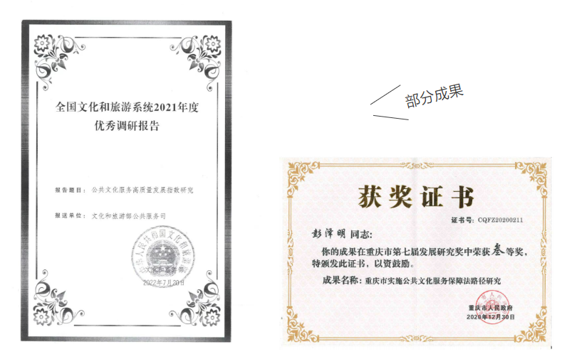近年来,基地以习近平新时代中国特色社会主义思想为指导,围绕国家公共文化服务和旅游公共服务的重大现实需要,紧密联系实际开展研究,推进跨学科研究,获国家社科基金艺术学重大项目和一般项目、文化和旅游部委托项目、出版专著多部、获评文化和旅游系统优秀调研报告和重庆市发展研究优秀成果奖等。
