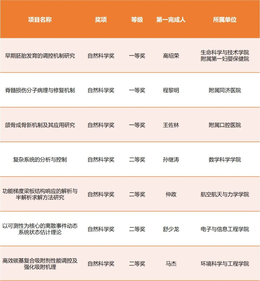 在获科学技术奖一等奖的11项成果中,获自然科学奖一等奖3项,分别是生命科学与技术学院、附属第一妇婴保健院高绍荣主持完成的“早期胚胎发育的调控机制研究”,附属同济医院程黎明主持完成的“脊髓损伤分子病理与修复机制”,附属口腔医院王佐林主持完成的“颌骨成骨新机制及其应用研究”。