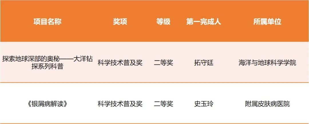 此外,获自然科学奖二等奖4项、技术发明奖二等奖2项、科技进步奖二等奖5项、科学技术普及奖二等奖2项、科技进步奖三等奖3项。