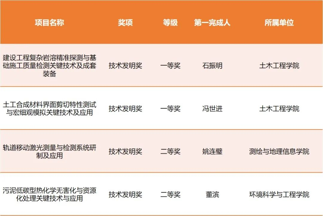 获技术发明奖一等奖2项,分别是土木工程学院石振明主持完成的“建设工程复杂岩溶精准探测与基础施工质量检测关键技术及成套装备”、土木工程学院冯世进主持完成的“土工合成材料界面剪切特性测试与宏细观模拟关键技术及应用”。