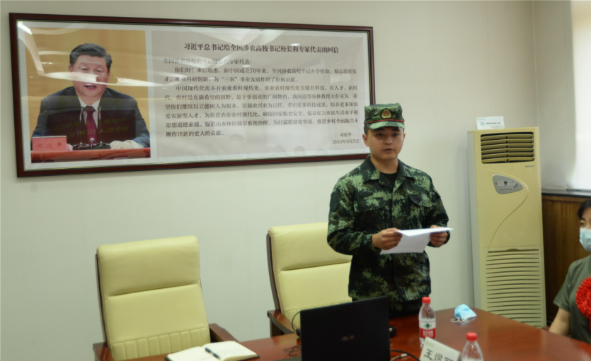学校欢送新兵座谈会上,寇子谦作为老兵代表送上祝福