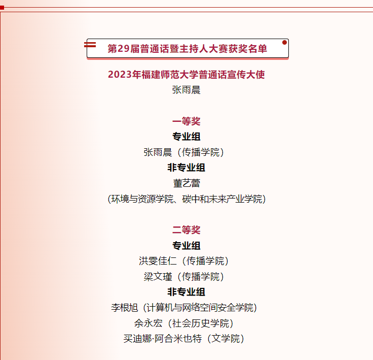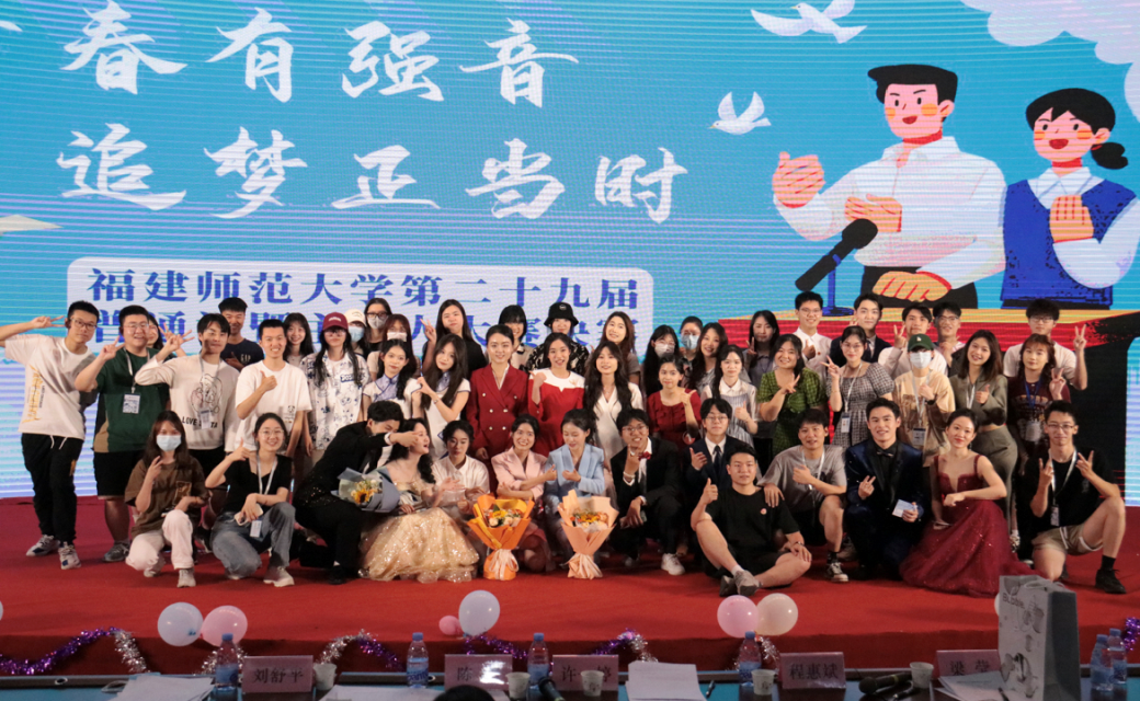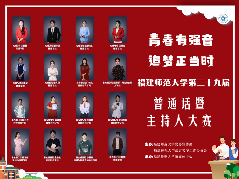 5月份,全校约400名在校生参与了由福建师范大学党委宣传部、校语言文字工作委员会主办,校融媒体中心承办的“青春有强音,追梦正当时”福建师范大学第二十九届普通话暨主持人大赛。经过初赛和复赛,专业组和非专业组共有16名选手晋级决赛。5月28日下午,决赛在旗山校区图书馆学术报告厅举办。我校传播学院原党委书记、国家级普通话测试员刘舒平老师,国家级普通话测试员、文学院陈鸿副教授,传播学院播音系主任许一婷副教授受邀担任本次比赛评委。校党委宣传部负责人,校融媒体中心指导老师,相关学院师生代表出席观摩。