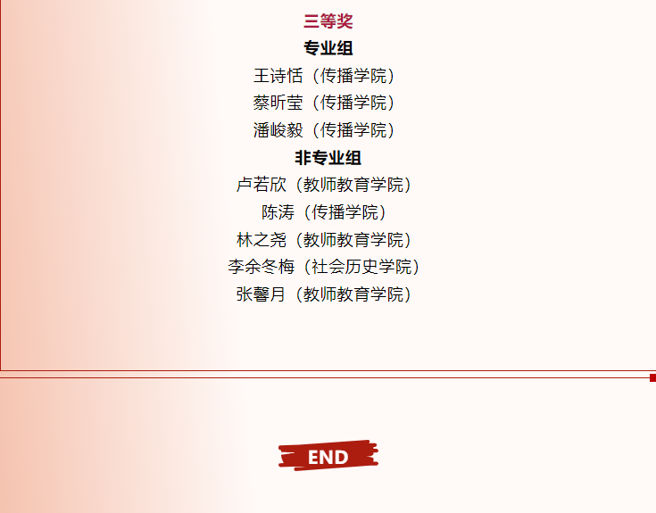 本届校普通话暨主持人大赛也是推动全校青年学生学习贯彻习近平新时代中国特色社会主义思想主题教育,实现“ 以学铸魂,以学增智,以学正风,以学促干 ”的一次实际行动。 专业组洪雯佳仁同学赛后颇有感触深刻,“通过比赛,我从红色故事的阅读者成为了舞台上的讲述者,感到很荣幸”。评委老师们对选手们做出充分肯定,“稳健的台风,自信的表达和浓烈的感情,这就是青年人该有的模样!”