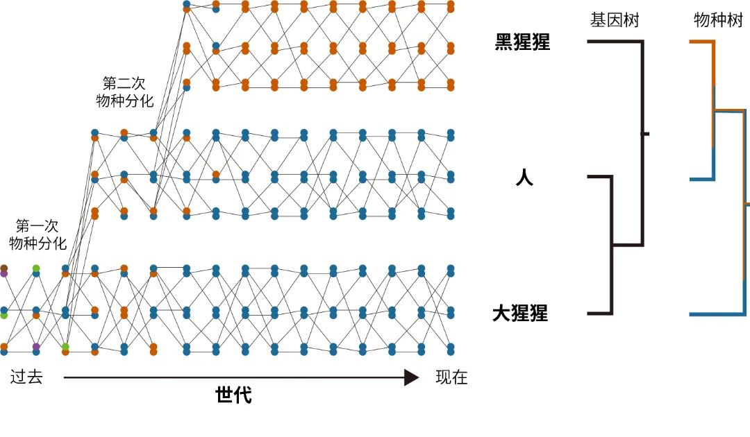 祖先的一部分基因多态性会被随机分流到分化出的不同物种里,从而造成亲缘关系较远的物种之间在某些基因上也有更高的相似性。这一演化遗传过程被称为不完全谱系分流。虽然人类最近缘的现生物种是黑猩猩,但是人类基因组上却有15%的区域与大猩猩更加相似。 导致这一现象的原因就是不完全谱系分流。
