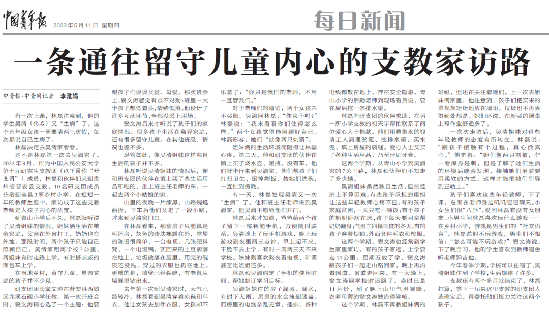 近日,我校第十届研究生支教团贵州分团支教学生的家访故事被刊登在《中国青年报》,故事讲述了我校学生窦文涛家访和林磊资助留守儿童姐妹花的动人事迹。