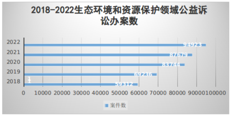在公益诉讼检察方面,生态环境领域公益诉讼案件规模逐年递增。2018年至2022年生态环境和资源保护领域公益诉讼办案数分别为59312件、69236件、83744件、87679件、94923件,呈逐年递增趋势,2022年较2018年上升超过60%。