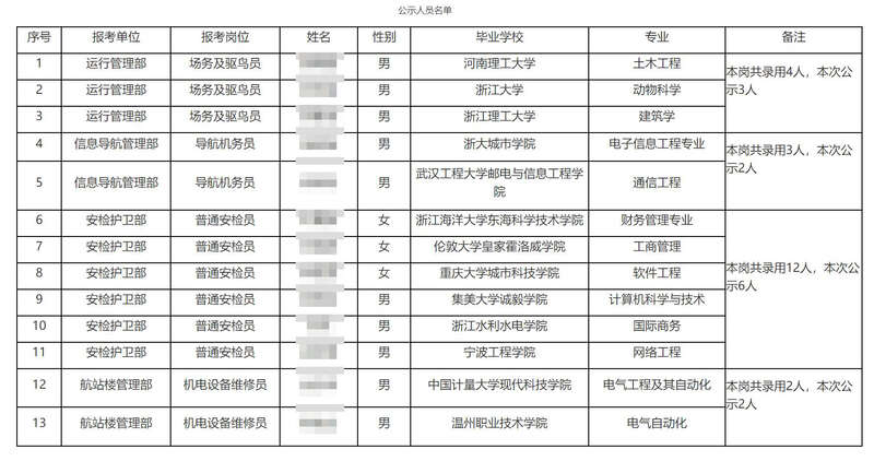 根据该公示,河南理工大学土木工程专业的别某、浙江大学动物科学专业的陈某、浙江理工大学建筑学专业的邱某拟被录用为“场务及驱鸟员”。另外,温州机场集团拟录用伦敦大学皇家霍洛威学院工商管理专业的林某、白俄罗斯国立大学财务管理专业的洪某为安检护卫部普通安检员,同一岗位拟录用的其余人员来自浙江海洋大学东海科学技术学院、重庆大学城市科技学院、集美大学诚毅学院等。