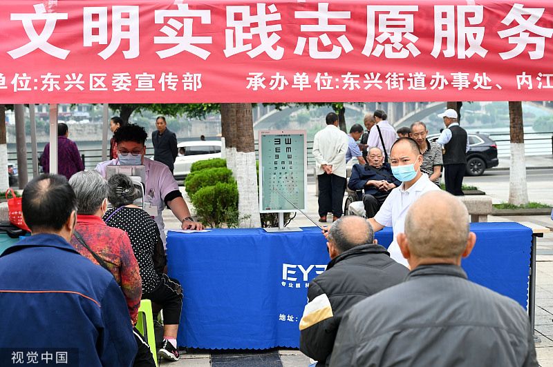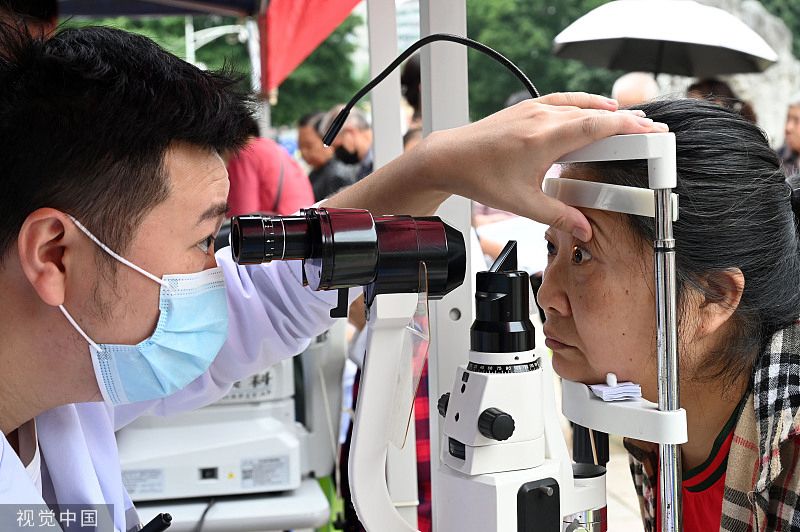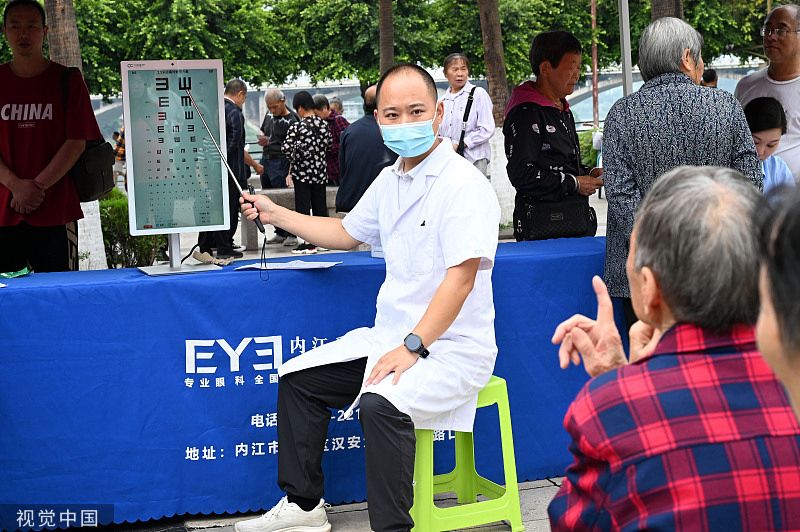 2023年6月5日,在四川省内江市东兴区大千广场,眼科专家为市民进行免费义诊。四川省内江市东兴区新时代文明实践中心在大千广场开展“全国爱眼日”志愿服务活动,组织医疗机构眼科专家开展眼睛健康免费义诊,并向市民普及科学用眼知识,增强市民的爱眼护眼意识。
