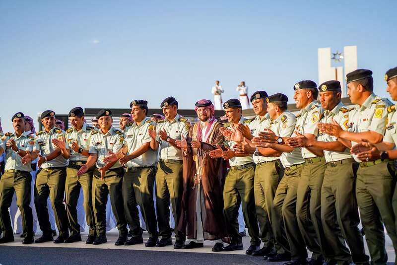 5月31日,约旦安曼,侯赛因王储(中)与约旦武装部队成员一起跳民俗舞蹈。图片来源 视觉中国