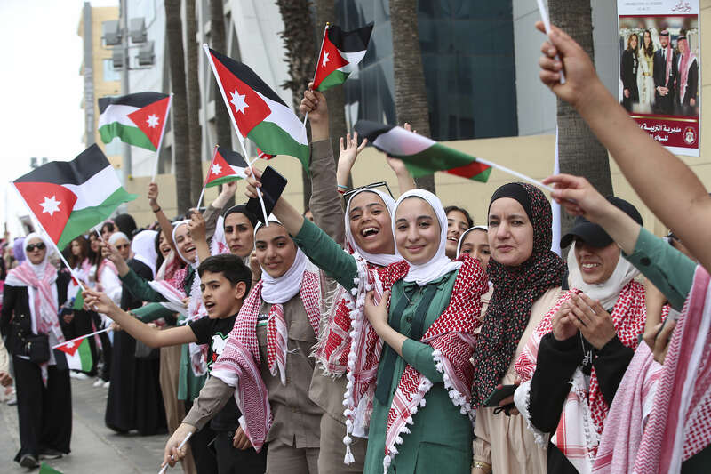 6月1日,约旦安曼,民众挥舞着国旗,等待皇家车队驶来。图片来源 视觉中国
