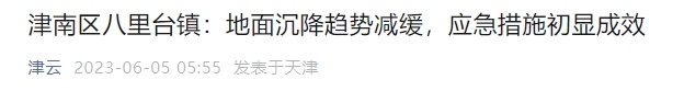 据“津云”微信公众号5日消息,6月4日,记者从现场了解到,津南区八里台镇局部地面沉降处置工作正有序推进中,地面沉降趋势减缓。