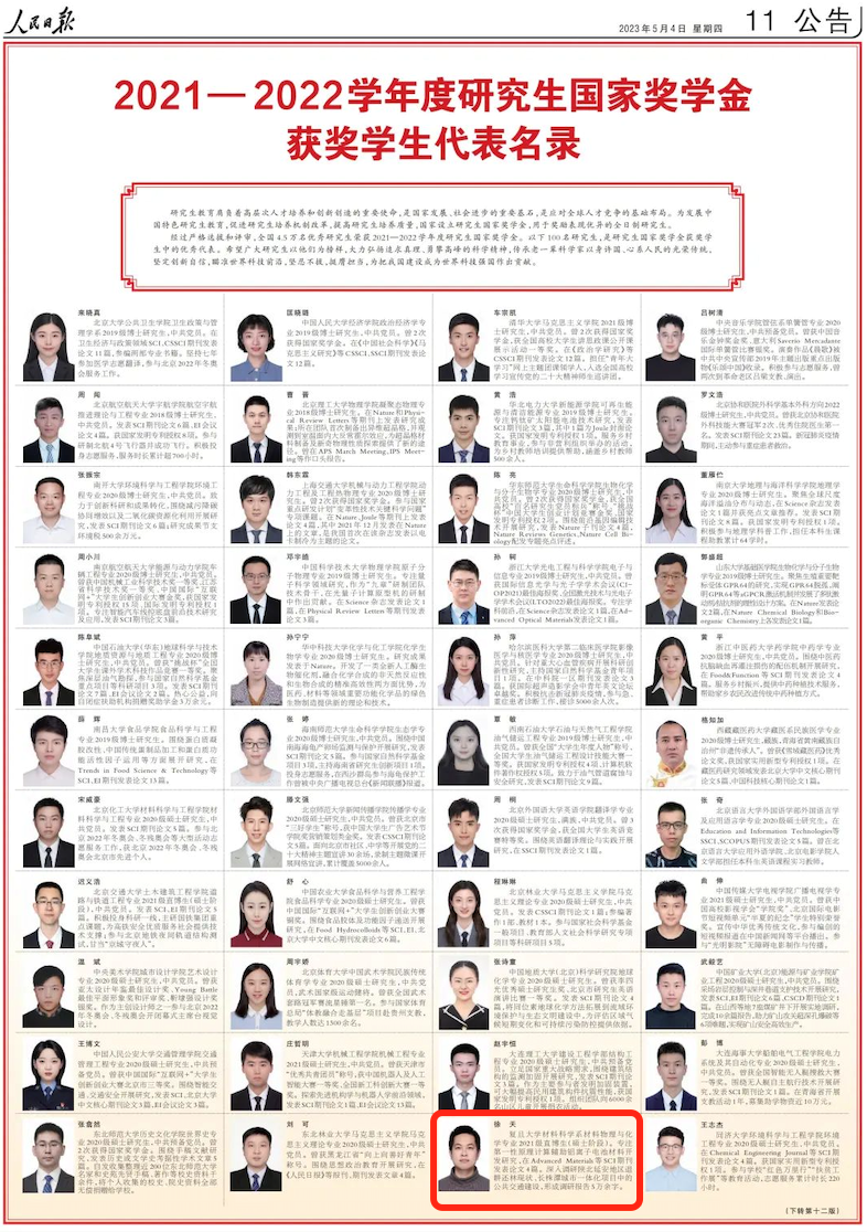 日前,徐天获2021—2022学年度研究生国家奖学金,登上《人民日报》。