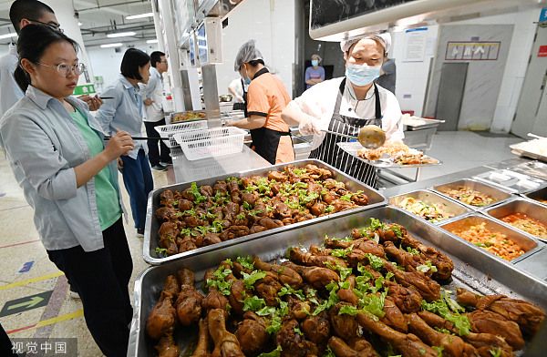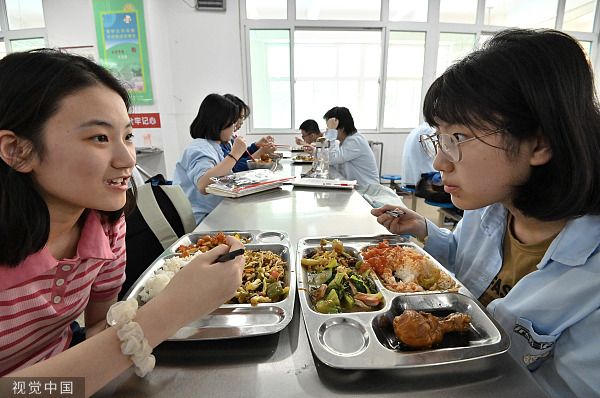 2023年6月6日,河北邯郸第一中学,餐厅工作人员将营养餐摆放好,等待高三学生前来就餐。