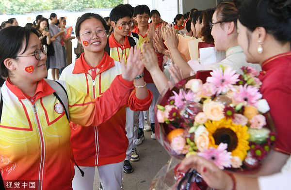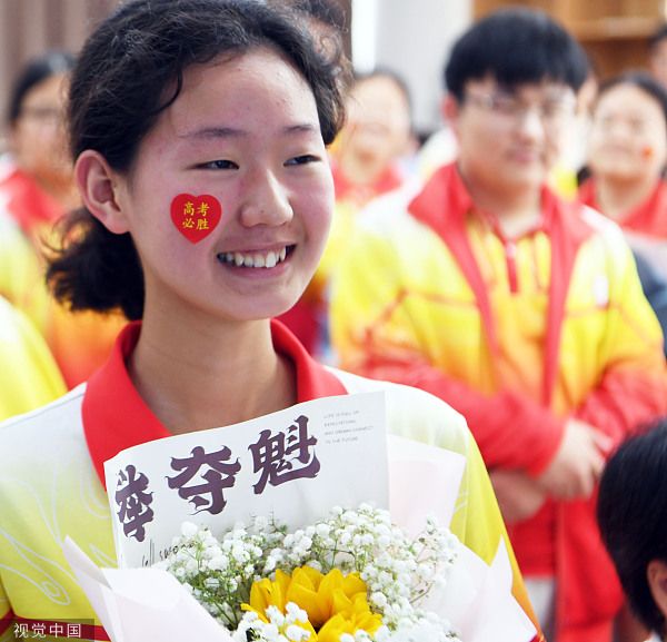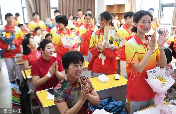 2023年6月6日,安徽亳州,市第十八中学,学生和家长正在与老师一起参加送考仪式。当日,2023年高考在即,安徽省亳州市第十八中学高三各班级举行简谱的高考送考仪式,通过送考学生夹道欢送、师生相互击掌鼓劲、考生家长着旗袍送鲜花等形式,暖心送考,让考生们轻松迎考。