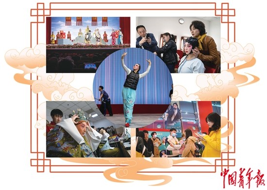右下:4月24日晚,北京梅兰芳大剧院后台,中国戏曲学院第七届中国京剧优秀青年演员研究生班教学汇报演出折子戏专场即将开演,来自中国人民大学京剧社的大学生准备入场观看演出。中青报·中青网记者 李峥苨/摄