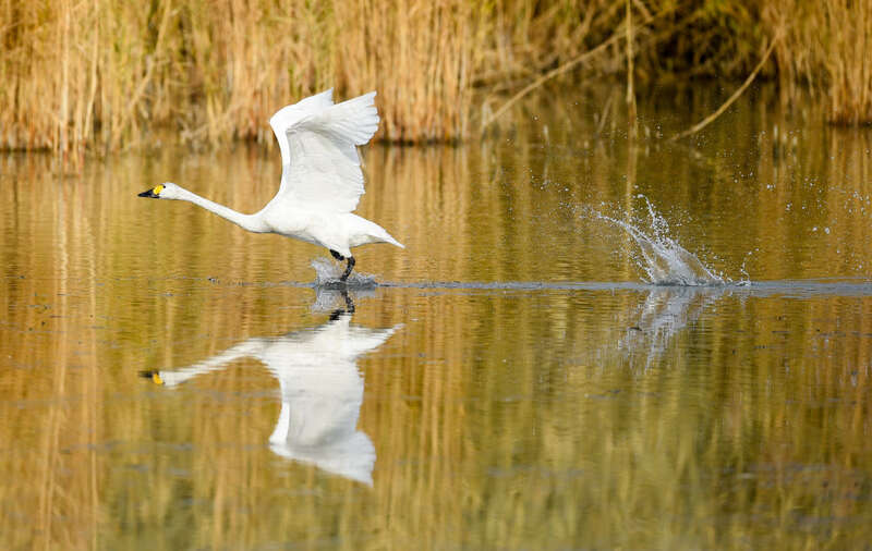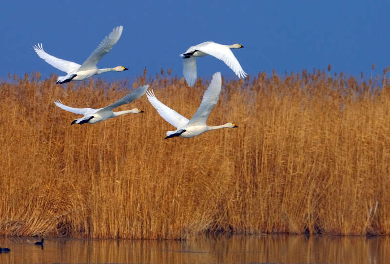 2020年11月15日,几只天鹅飞翔在乌梁素海上空。
