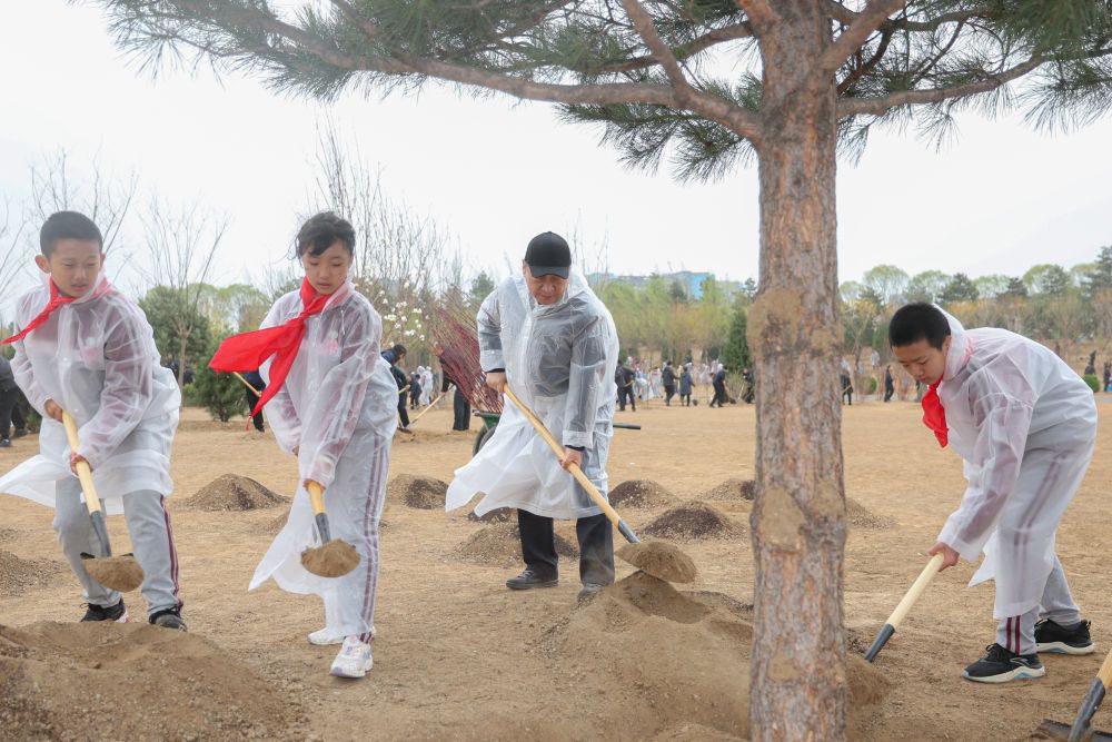 2023年4月4日,习近平冒雨在北京市朝阳区东坝中心公园参加首都义务植树活动。