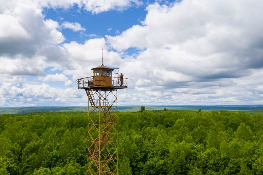 黑龙江省伊春市乌伊岭林业局有限公司阿廷河林场分公司护林员刘宏伟在防火瞭望塔瞭望(2021年6月4日摄,无人机照片)。