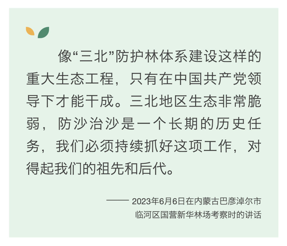 6月5日至6日,中共中央总书记、国家主席、中央军委主席习近平在内蒙古自治区巴彦淖尔市考察,主持召开加强荒漠化综合防治和推进“三北”等重点生态工程建设座谈会并发表重要讲话。
