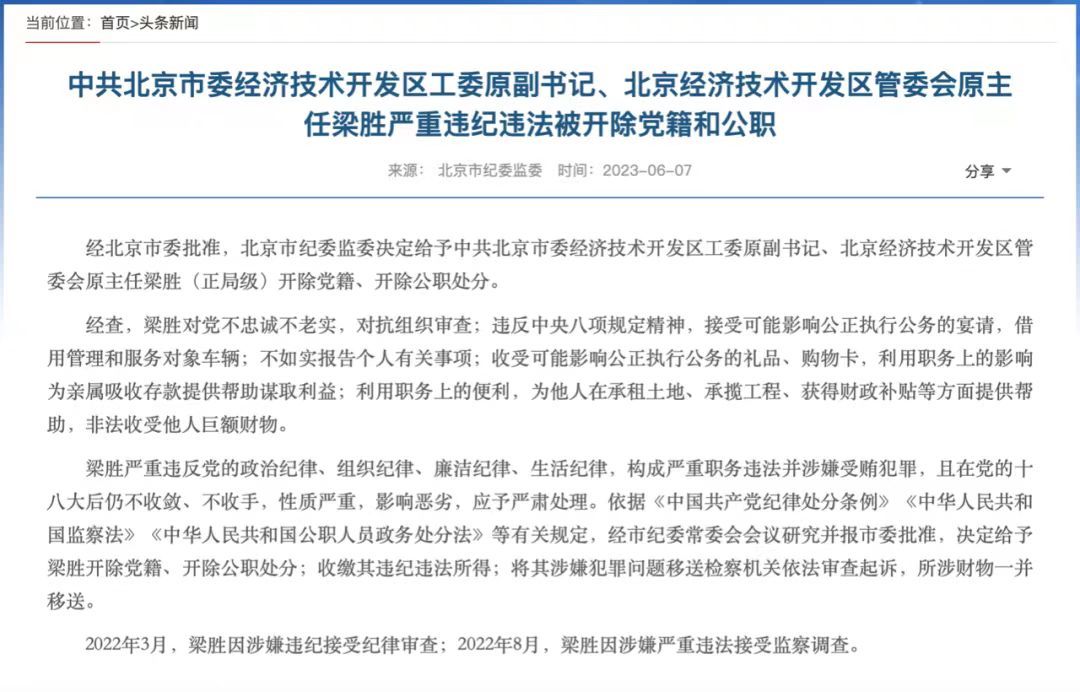 据北京市纪委监委消息,经北京市委批准,北京市纪委监委决定给予中共北京市委经济技术开发区工委原副书记、北京经济技术开发区管委会原主任梁胜(正局级)开除党籍、开除公职处分。