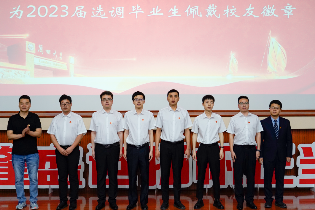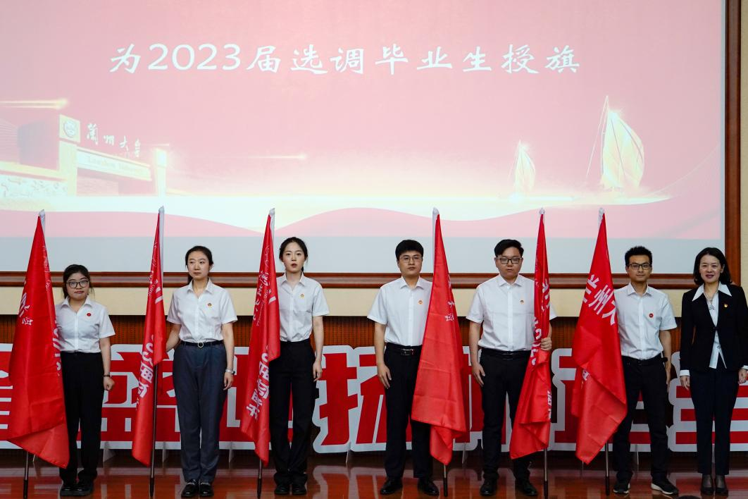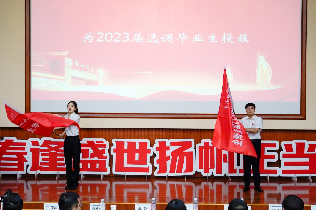 学校组织部、团委负责人为选调生代表佩戴校友徽章,曹红为选调生代表授旗,仪式在大家响亮的口号“自强不息,独树一帜;青春逢盛世,扬帆正当时”和挥舞的旗帜中结束。