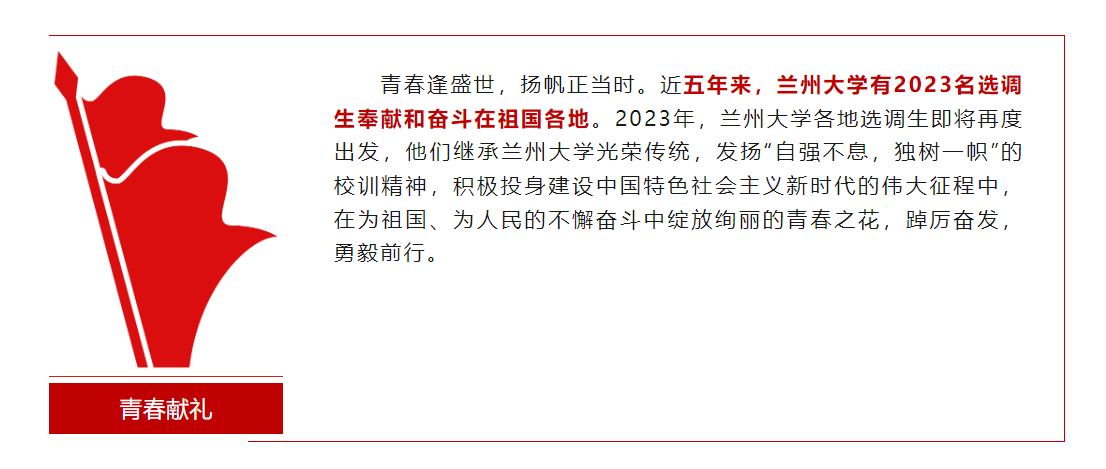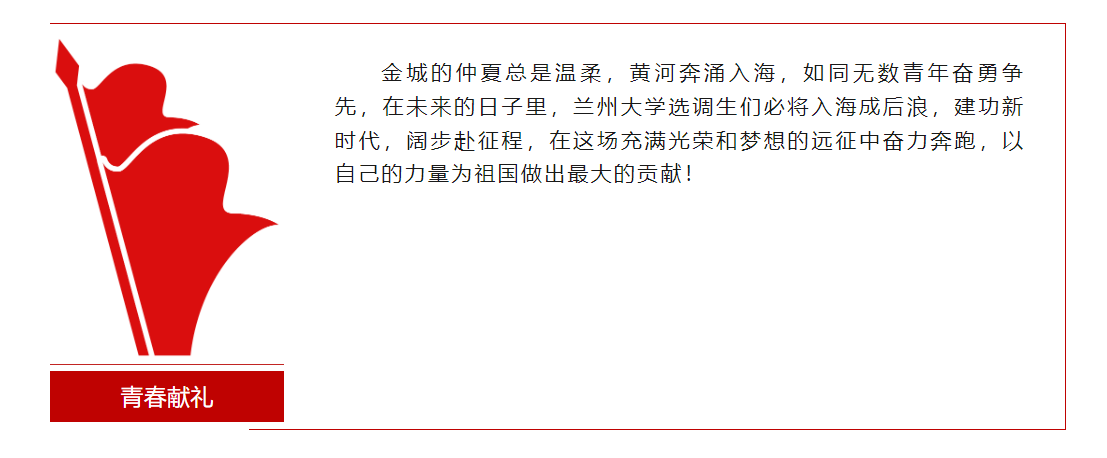 出征仪式上,兰州大学副校长曹红从锤炼政治品格、练就过硬本领、厚植为民情怀、保持身心健康、传承兰大精神等五个方面对选调毕业生寄语,希望同学们奔赴祖国和人民最需要的地方建功立业,同时和学校保持紧密联系,兰州大学是兰大人永远的家。