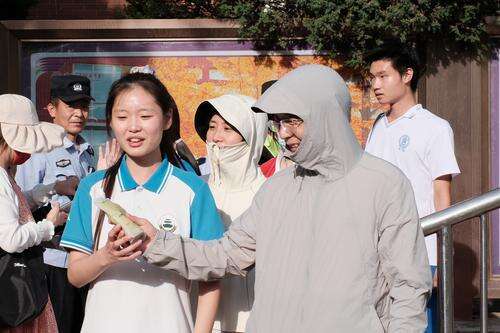 6月7日下午,清华大学附属中学考点。当日考试结束,考生们走出考场。一名家长递给考生绿豆沙解渴防暑。