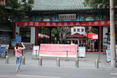 6月7日下午,北京市第二十中学考点,一名考生家长拿出手机拍摄学校大门。