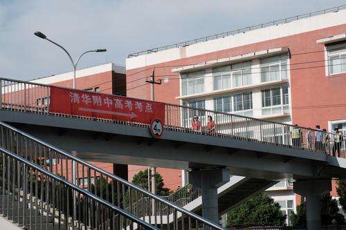 6月7日下午,清华大学附属中学考点,校门口的天桥上,学校贴心地准备了指示横幅。