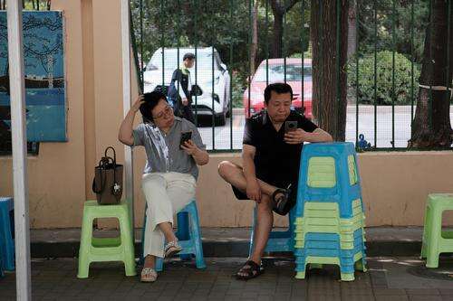 6月7日下午,北京市第二十中学考点,家长们坐在校门外的路边交流。