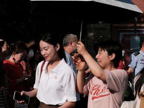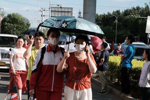 6月7日下午,清华大学附属中学考点。当日考试结束,考生们走出考场。一名家长为考生打伞遮阳。