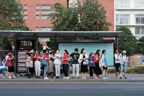 6月7日下午,清华大学附属中学考点。当日考试结束,考生们正在等待公交车。