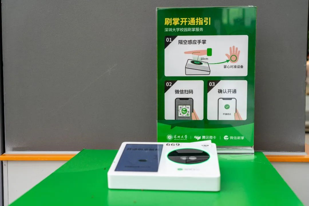 5月30日,微信支付、腾讯微卡团队联合深圳大学创新试点的“校园一掌通”服务正式上线。目前已有5台刷掌机在深圳大学听山餐厅投入使用。