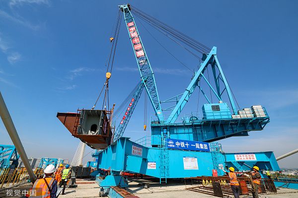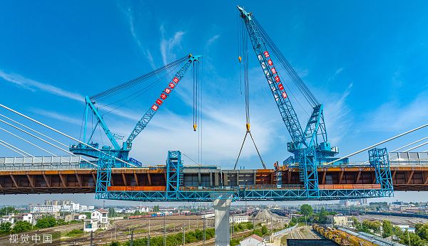 2023年6月8日,湖北襄阳,中铁十一局工作人员吊装襄阳北编组站大桥最后一段钢主梁。