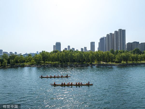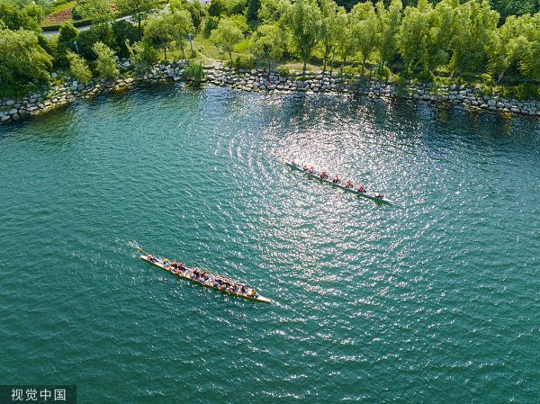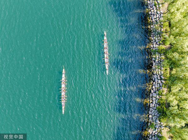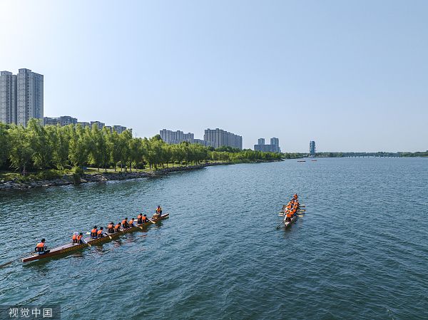 2023年6月8日,江苏连云港,东海县西双湖风景区,多支龙舟赛参赛队伍在西双湖水域进行训练,积极备战端午节期间举行的2023年连云港市第二届海陵湖龙舟赛。