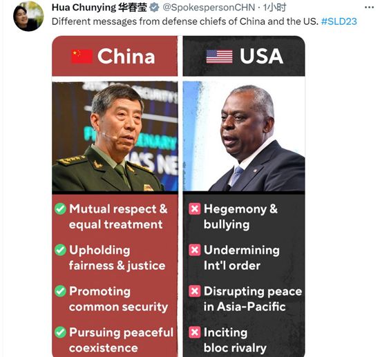 “中美防长释放出不同信息。”中国外交部部长助理、发言人华春莹7日晚发推,用一组对比图,展现出中国防长李尚福与美国防长奥斯汀在香格里拉对话会上向世界传递出的不同信息。
