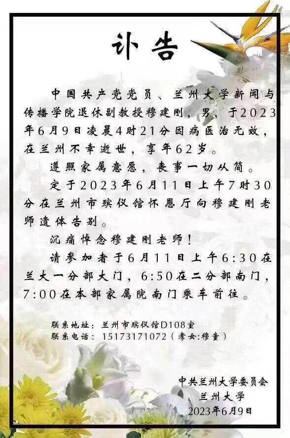 据澎湃新闻消息,6月9日上午,兰州大学知名公共关系学者穆建刚因病医治无效,于2023年6月9日上午在兰州去世,享年62岁。