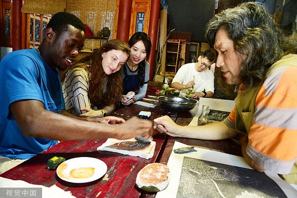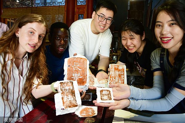 当天,江苏大学部分中外大学生来到镇江市金山街道西津古渡社区,在民俗专家指导下体验拓印、剪纸、古琴等传统文化技艺,感受中国非遗民俗文化的魅力,迎接“文化和自然遗产日”的到来。