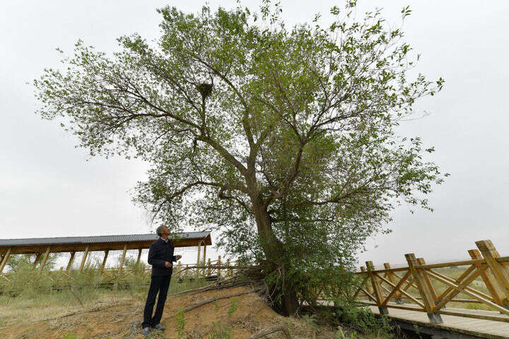 在不远处的八步沙第一代治沙人治沙点,一棵树冠超10米的白榆傲然挺立,树杈间喜鹊筑巢,不时传来啁啾叫声。顺着树干朝下看,部分树根裸露在外,延伸错综间,不断生出新的榆树苗。