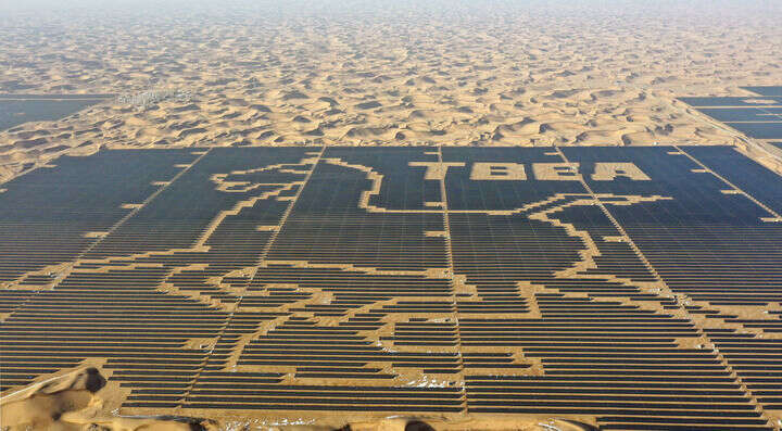 在腾格里沙漠东南缘的武威市凉州区九墩滩光伏治沙示范园区,一排排高高架起的光伏板向沙海深处延伸。