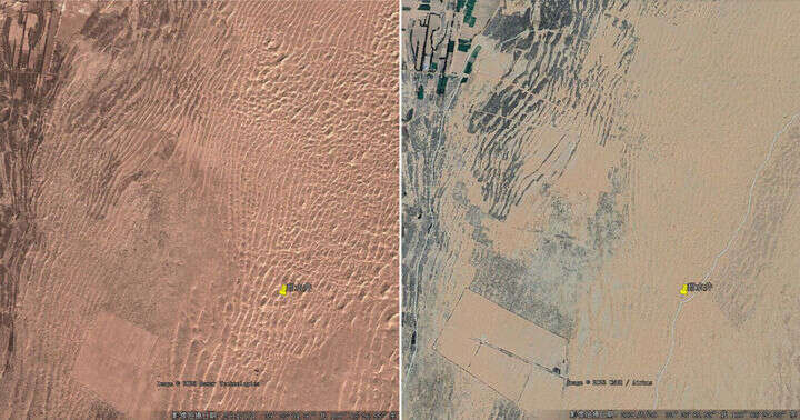 从程序员变成恋上沙海的场长,返回家乡张掖市临泽县创业的贾其煜说起自己的故事时,总要十分自豪地掏出两张相隔7年的卫星对比图感叹:“我和职工们耕耘的这片林场,已经向巴丹吉林沙漠腹地挺进了14公里。”