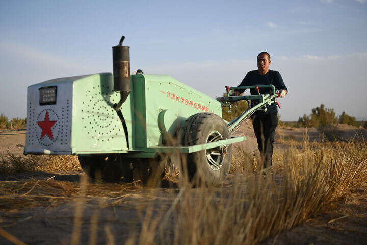 “新一代手扶式沙障机在不同坡度的沙丘上都可以用,效率是人工作业的4倍至6倍。”甘肃省治沙研究所二级研究员徐先英介绍,从2020年起,甘肃、内蒙古等地运用手扶式沙障机已完成机械治沙超万亩。