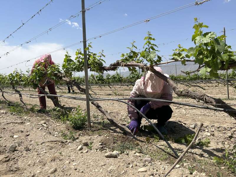 宁夏志辉原石酒庄的葡萄园里,昊苑村的村民们在抹芽。新华社记者艾福梅 摄