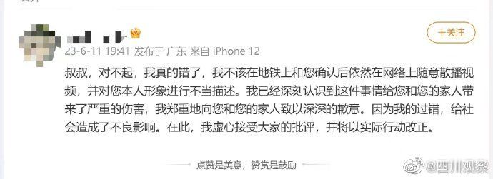 近日,广州地铁8号线“大叔被疑偷拍自证清白后仍被曝光”事件引发关注。6月11日,该女子公开道歉。记者今天从四川大学了解到,学校对此高度重视,已密切联系属地警方及当事学生了解核实情况,将按程序依规依纪处理。