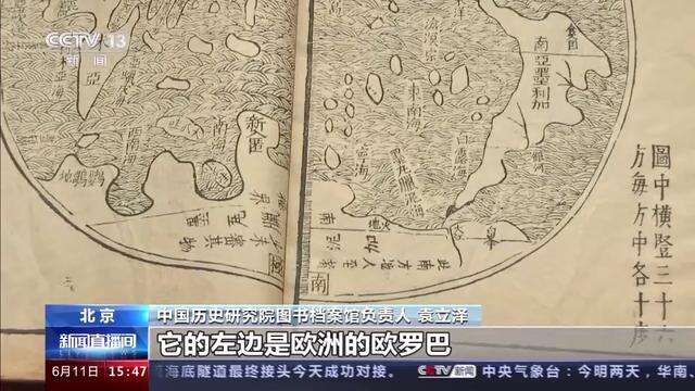 中国历史研究院图书档案馆负责人 袁立泽:这幅图是16世纪末,西方第一批来华传教士利玛窦主持绘制的。把西方当时先进的制图技术带到了中国,同时他有意识地吸收了中国的制图经验和理念。今天我们所熟悉的七大洲四大洋,在图中应该说已经标示出了六大洲和三大洋,就是亚洲的亚细亚。它的左边是欧洲的欧罗巴,南面就是今天的非洲叫利未亚,改变了以往以欧洲为中心的绘图方式。它是中西文明交流互鉴的一个结晶和有力见证。