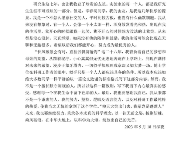 “整整 23 年的求学生涯……和我接触时间最长也是最让我没齿难忘的,还是我硕士及博士的导师程博教授……程老师说她愿意做我的伯乐,只要我考虑清楚,她实验室的大门永远向我敞开。这是我人生最灰暗的时刻,看到的能够照亮每一处黑暗角落的烈阳。”