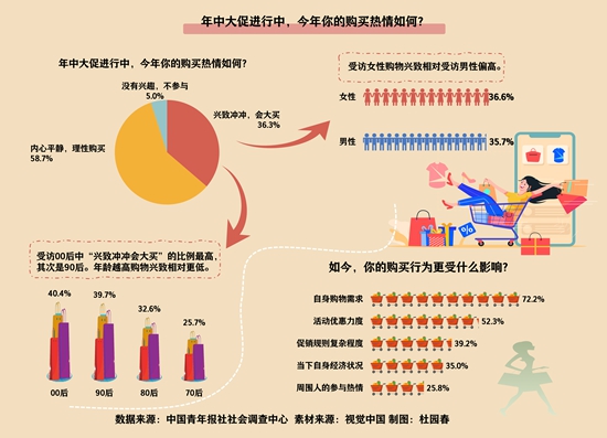 上周,中国青年报社社会调查中心联合问卷网(wenjuan.com),对1001名受访者进行的一项调查显示,今年年中大促,消费者整体呈现出了理性消费的趋势,36.3%的受访者兴致冲冲要大买,58.7%的受访者则表示内心平静,理性购买。受访者的购买行为,更多地受自身购物需求、活动优惠力度、促销规则复杂度的影响。