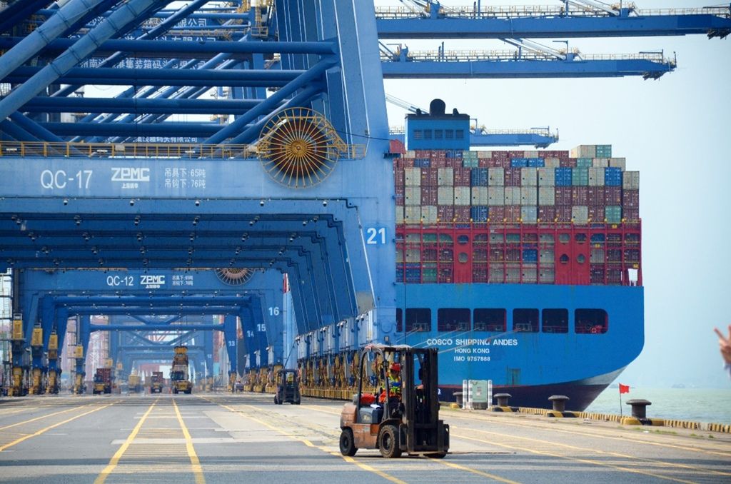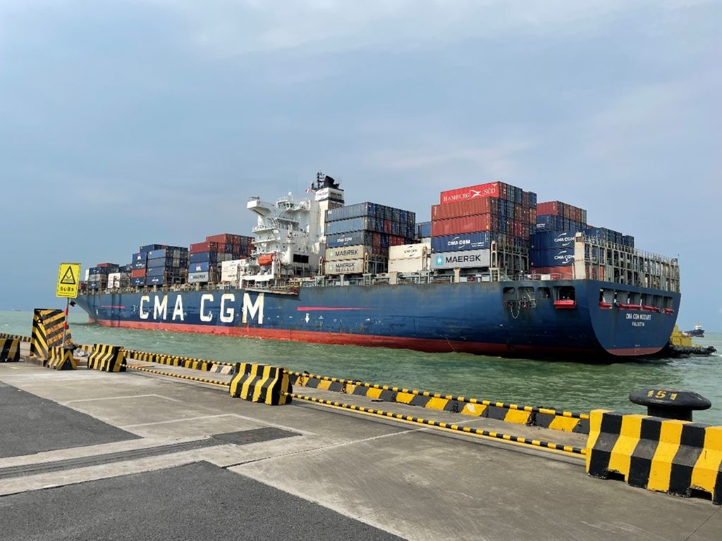 6月13日,一艘货船正在靠岸广州港南沙港区码头。新华网 陈畅 摄