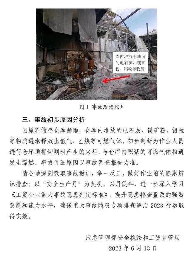 事故初步原因分析:因原料储存仓库漏雨,仓库内堆放的电石灰、镁矿粉、铝粒等物质遇水释放出氢气、乙炔等可燃气体。初步判断为作业人员进行仓库顶棚切割时产生的火花,与仓库内积聚的可燃气体相遇发生爆燃。