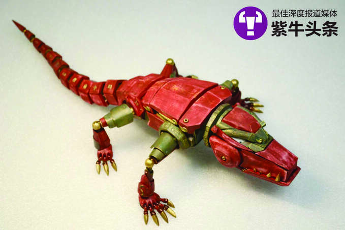 “我想尽量还原动画中久经百战的蜥蜴造型,蜥蜴的头盖骨和眉骨的材料主要是桃木,因为在传统的民俗中,桃木是吉祥的,我就选择了桃木,之后刷朱漆,再用节节草打磨木材,达到做旧的效果。大漆是从树上开采的,是相当古老的工艺,是真正活着的非物质文化遗产。蜥蜴大部分用的也都是传统工艺,也用了电钻、线锯、弹簧等现代工艺。蜥蜴的眼睛和后背的八卦图是可以亮的。灯用的是纽扣、电池、电路板等材料。”徐海罡说。